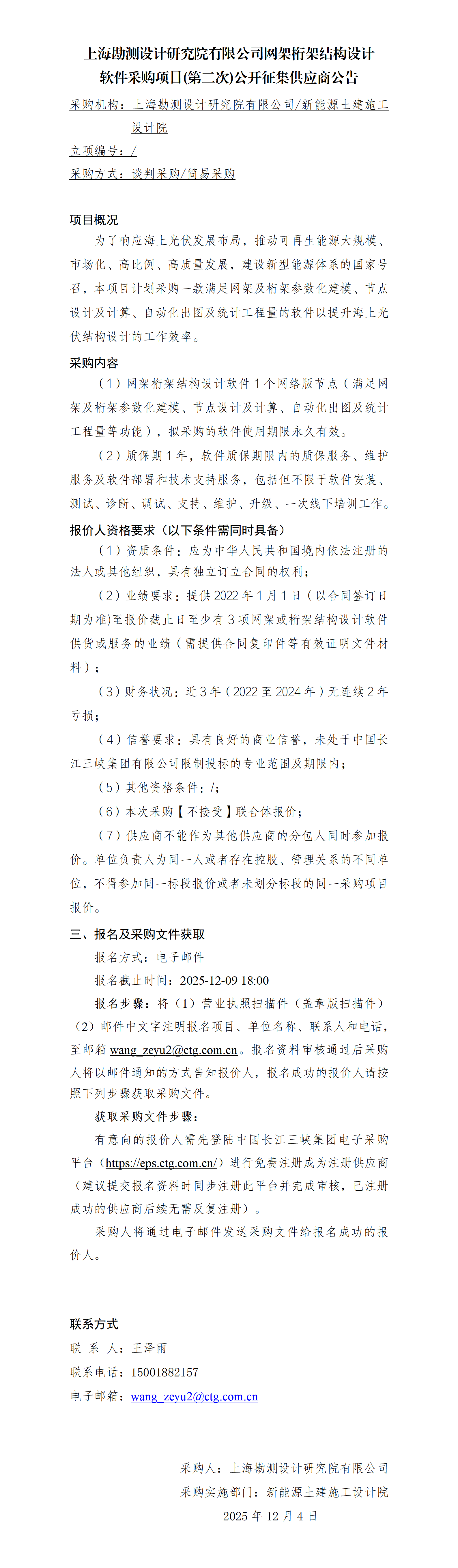 上海勘測(cè)設(shè)計(jì)研究院有限公司網(wǎng)架桁架結(jié)構(gòu)設(shè)計(jì) 軟件采購(gòu)項(xiàng)目公開(kāi)征集供應(yīng)商公告
